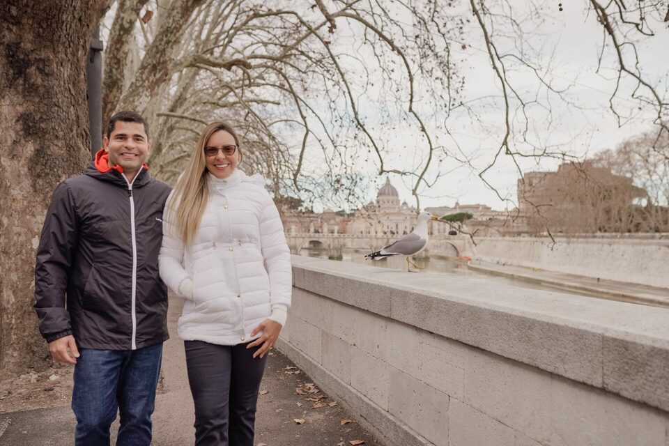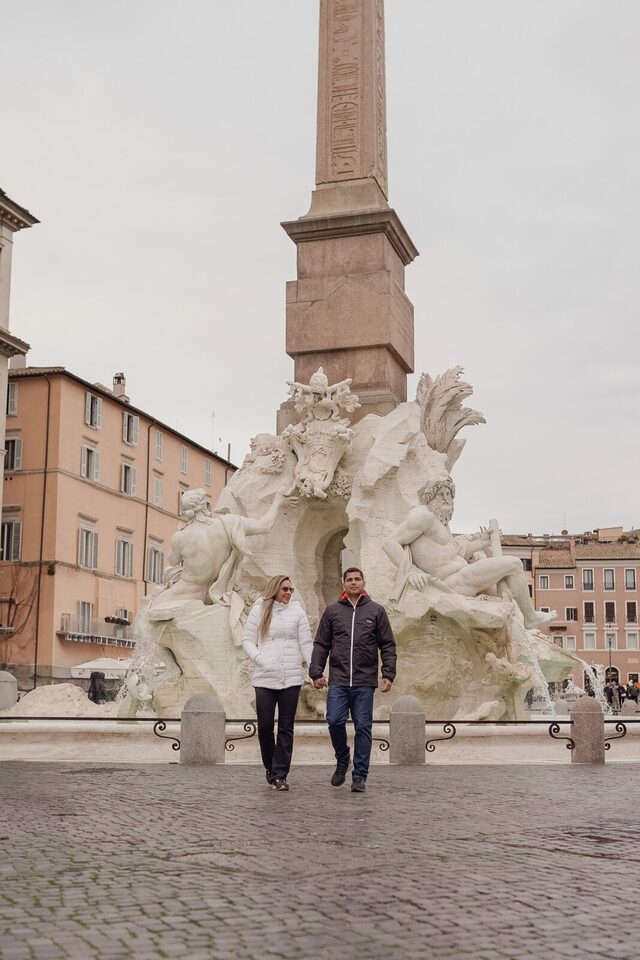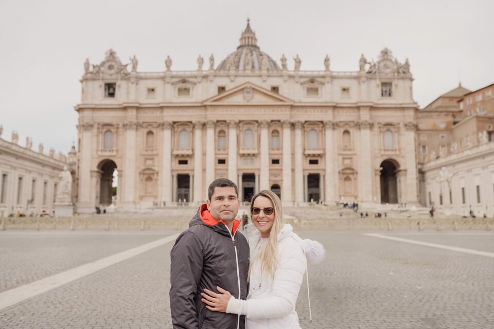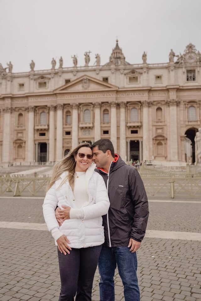 Na charmosa Piazza Navona, Andréa e Carlos se perderam entre as fontes barrocas e a energia vibrante da praça, criando registros cheios de vida e emoção. Depois, seguimos para a grandiosidade do Vaticano, onde as fotos capturaram toda a espiritualidade e imponência do local.