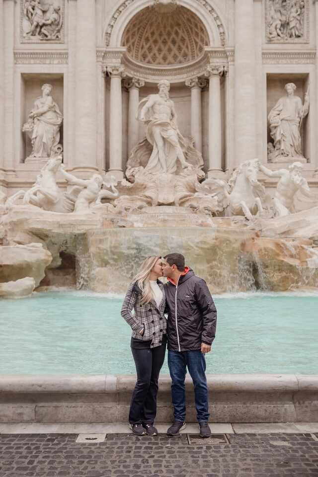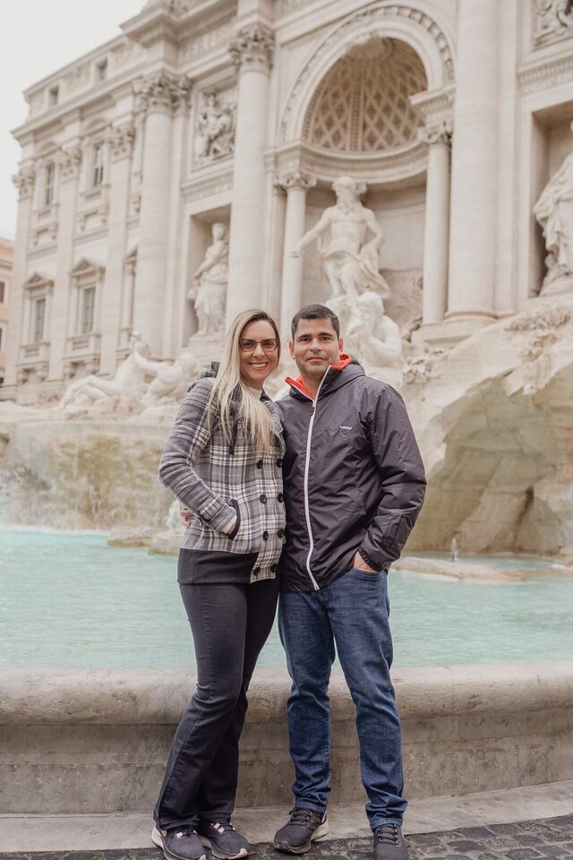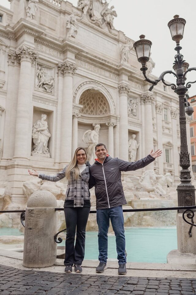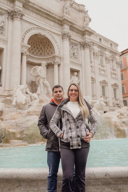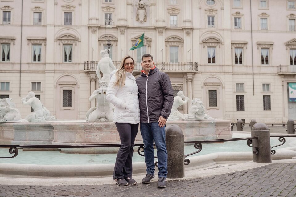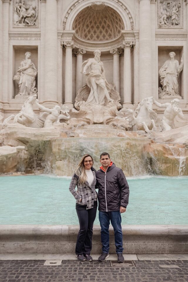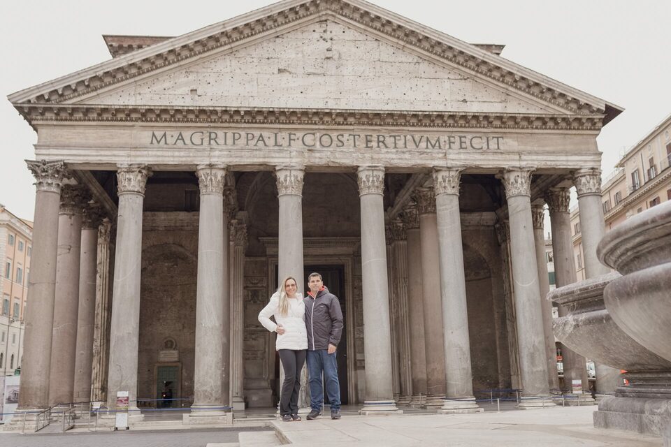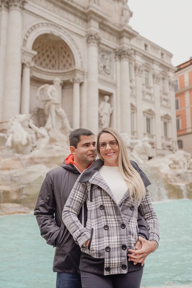 Nosso tour fotográfico começou na deslumbrante Fontana di Trevi, onde o casal aproveitou para jogar suas moedas e fazer desejos, seguindo a tradição local. Em seguida, fomos até o imponente Pantheon, um dos monumentos mais bem preservados da Roma Antiga, com sua arquitetura monumental e atmosfera única.