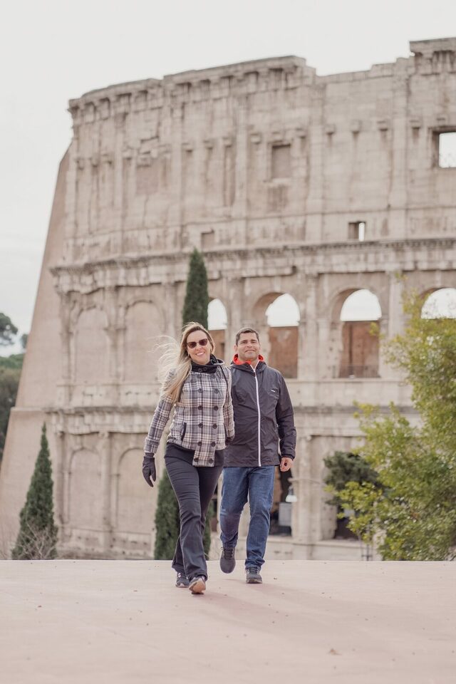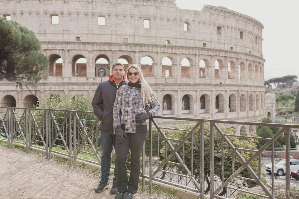 Para encerrar o dia com chave de ouro, finalizamos no icônico Coliseu, símbolo de Roma e cenário perfeito para fotos cheias de história e significado. A luz do fim de tarde deu um toque mágico às imagens, eternizando a conexão única deste casal em meio ao cenário milenar.