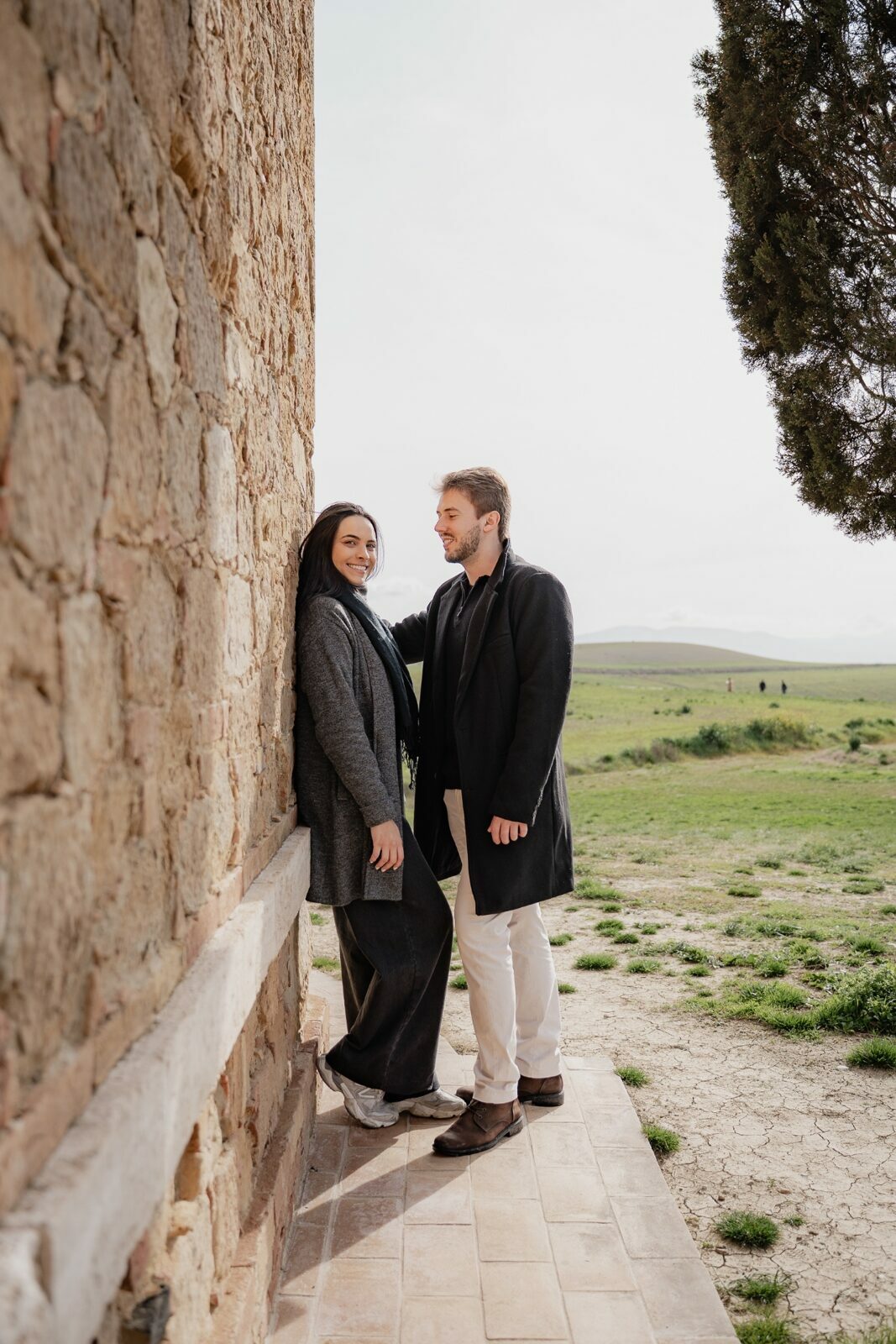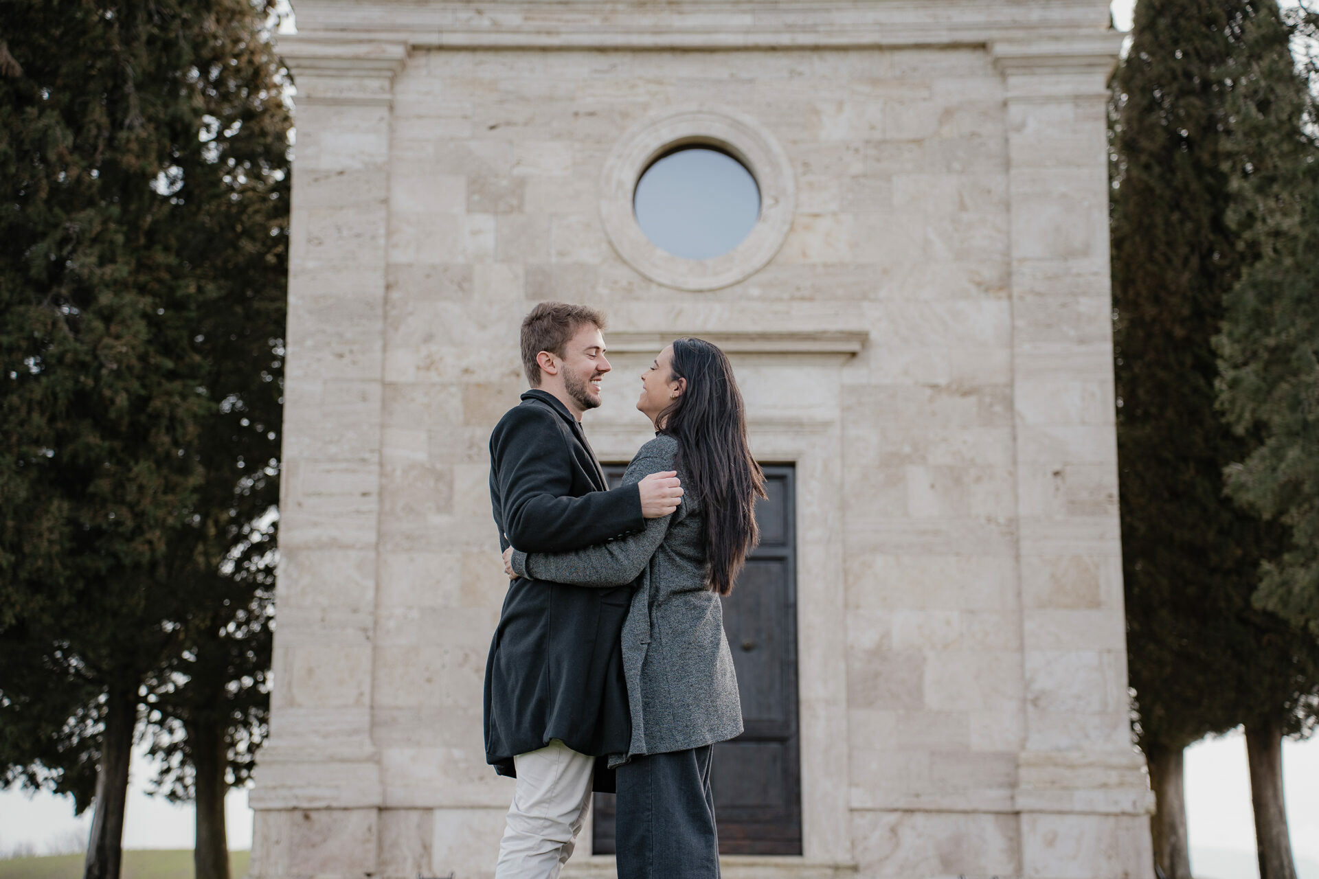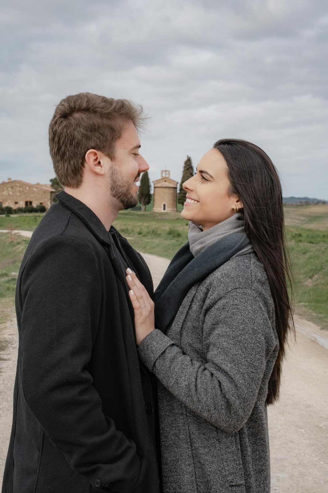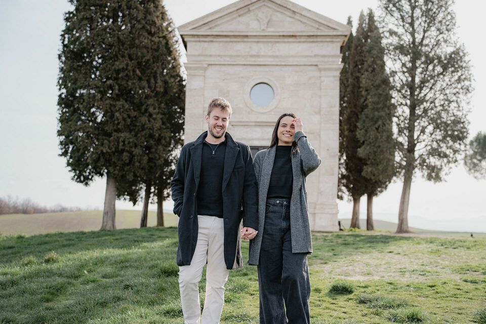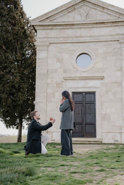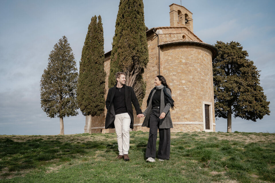 Além de registrar o momento, ele precisava de ajuda para escolher o local perfeito. A Toscana é cheia de paisagens incríveis, mas sugeri um lugar que sempre impressiona: a Capela da Madonna di Vitaleta, um dos cenários mais icônicos da região.