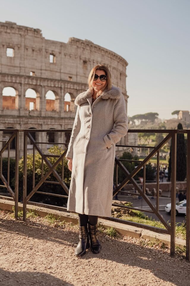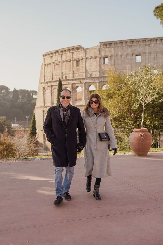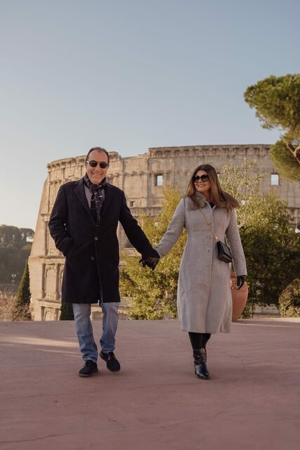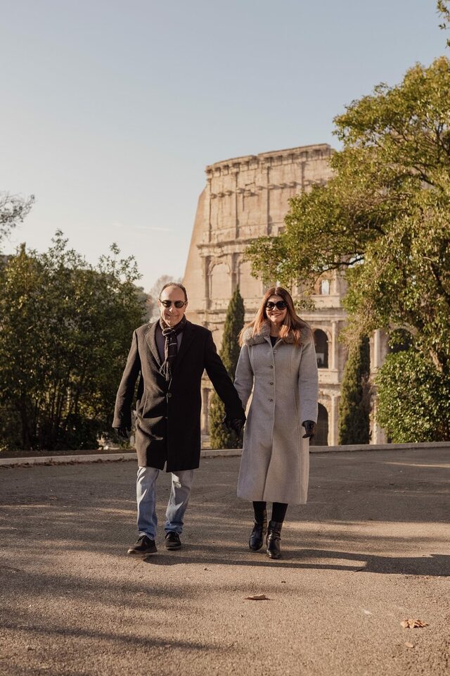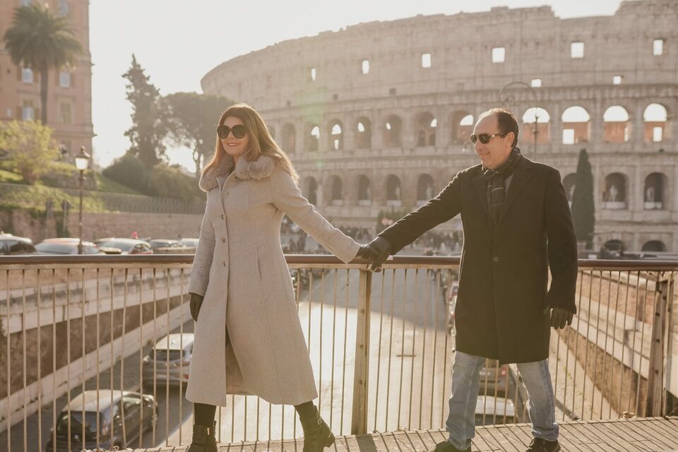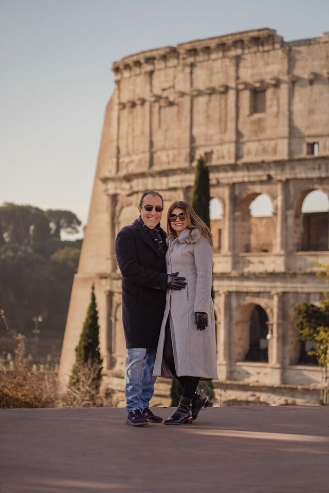 Naquela tarde ensolarada, começamos o ensaio com a leveza e a alegria de quem está vivendo um sonho. Mas o clímax veio quando paramos em um ponto estratégico, com o Coliseu como pano de fundo.